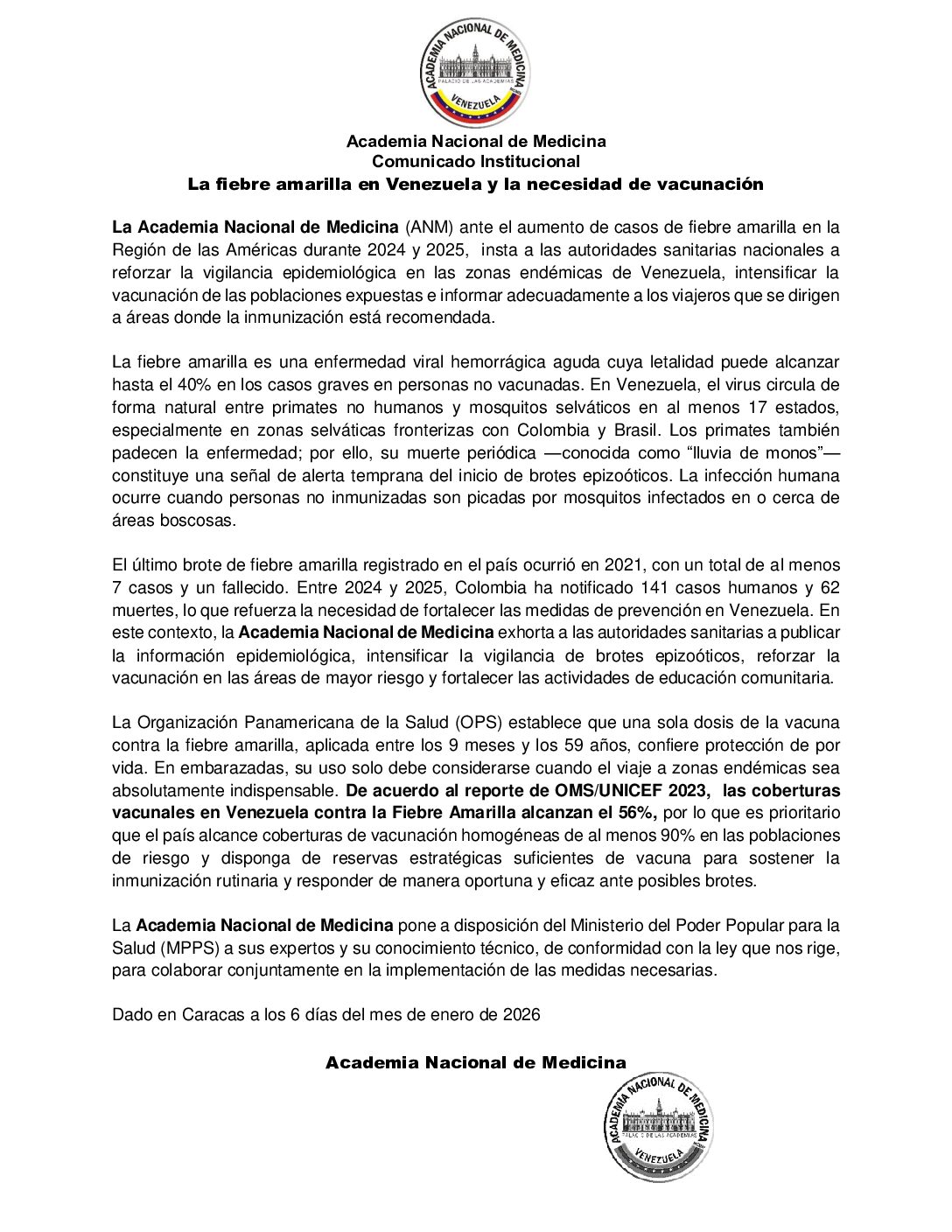 ANM de Venezuela pide reforzar vacunación contra fiebre amarilla en áreas de riesgo