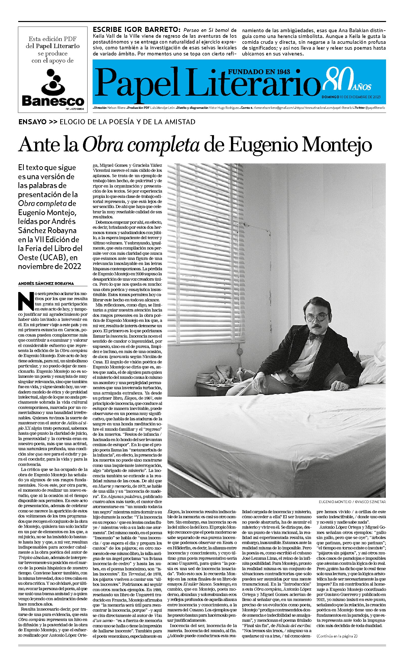 Elogio de Eugenio Montejo en el Papel Literario