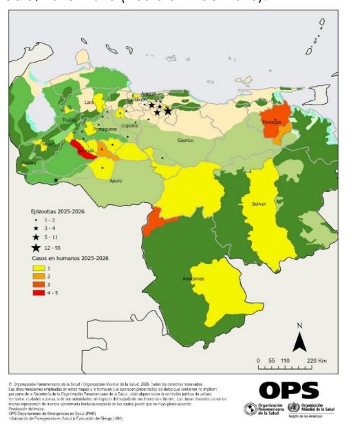 En 2026, informa la OPS, los casos se registraron principalmente en Colombia en el departamento del Tolima y en Venezuela en los estados de Aragua, Barinas, Lara y Monagas.