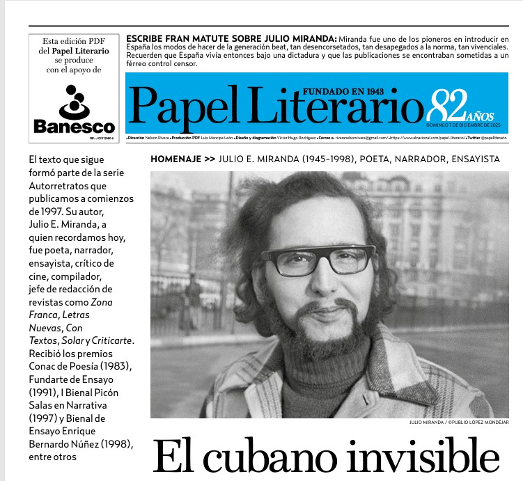 Este dossier incluye, además, retratos de Miranda de sus años previos a 1976, realizados por dos fotógrafos españoles fundamentales: Demetrio E. Brisset y Publio López Mondéjar, ambos sus amigos. Por último, quiero agregar dos recomendaciones. Una, la revista Calle del aire, número 4 (abril de 2022) publicó un documentado ensayo de Fran G. Matute, Maquillando el cadáver español de Julio Miranda, sobre sus años españoles. Dos: en la revista Encuentro de la cultura cubana, números 12 y 13, 1999, está Desapareció un cubano invisible, homenaje de Demetrio E. Brisset a Miranda, en el que señala: “dejó diez textos inéditos, entre ellos, dos novelas”. Ambos están disponibles en la web. Insisto por una consideración obvia: nuestra visión de Julio E. Miranda queda incompleta si no nos hacemos cargo de sus libros y avatares antes de que se estableciera en Venezuela.