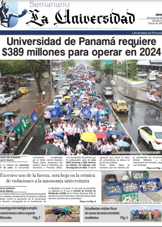 En la mañana del miércoles 21 de junio, la comunidad universitaria, encabezada por el rector, doctor Eduardo Flores Castro, emprendió una marcha hacia el Ministerio de Economía y Finanzas (MEF), con el propósito de solicitar que el presupuesto para el ciclo 2024 ascienda a 389 millones de dólares, 35 millones más del asignado en 2023. El fuerte aguacero que cubrió la masa de universitarios no detuvo la acción de protesta, reseña el Semanario La Universidad en su información de apertura.