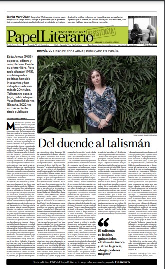 Amalia Iglesias Serna (1962) es filóloga, poeta y periodista. La página 1 trae el texto que escribió sobre Talismanes en fuga, el más reciente libro de Edda Armas (1955), publicado en España por la Editorial Vaso Roto: “En Talismanes para la fuga llama poderosamente la atención el abanico de respuestas que ofrece a la eterna pregunta de qué es la poesía o para qué sirve, respuestas que brotan implícitas entre los versos, a veces sin necesidad de ser nombradas.