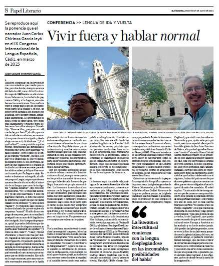 En marzo de 2023 se realizó en Cádiz, España, el IX Congreso de la Lengua Española. Vivir fuera y hablar ‘normal’ se titula la ponencia que Juan Carlos Chirinos leyó en el encuentro: “La literatura que trata de la vida y milagros de los venezolanos fuera ha ido en constante crecimiento, como es normal en un país del que han emigrado siete millones. En Venezuela estábamos acostumbrados a regresar más que a irnos, y el discurso narrativo se ha adaptado a las nuevas circunstancias, lo cual ha dado no pocas obras. El constreñido espacio me obliga a obliterar a decenas de autores y circunscribirme a unos pocos”. En su recorrido comenta de forma somera obras de Israel Centeno, Rodrigo Blanco Calderón y Juan Carlos Méndez Guédez, venezolanos, y de autores de otros países como Rita Indiana (República Dominicana) y Santiago Elordi (Chile).
