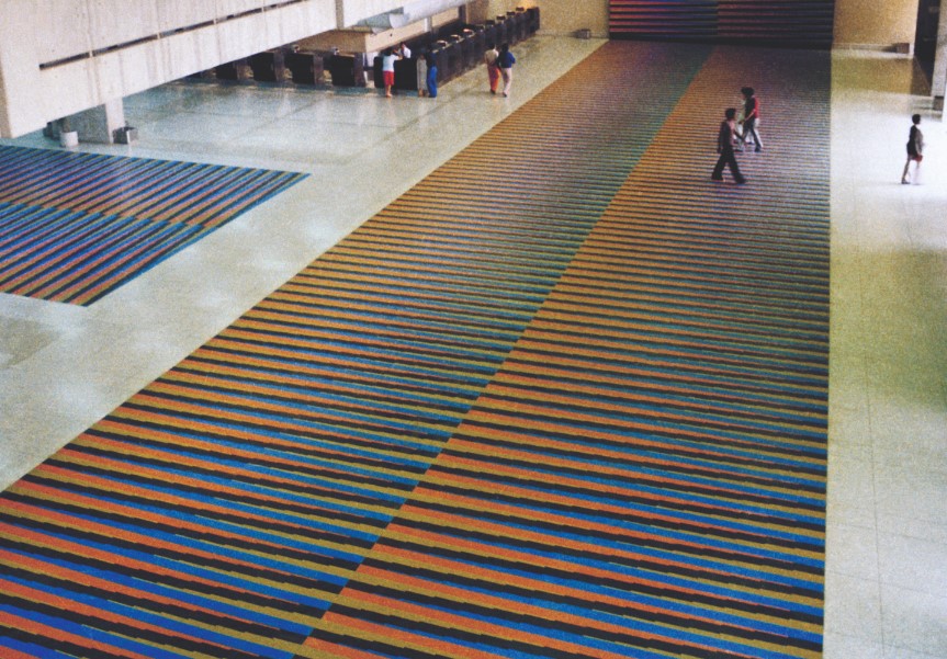 El niño sacó del bolso de su abuela un camioncito de volteo que insistió en llevar al aeropuerto y comenzó a pasearlo por las franjas de colores; el piso ícono de la modernidad de la Venezuela de los setenta diseñado por el maestro Carlos Cruz Diez interesa al niño vivamente; su camión debe sortear las líneas negras -pantanos que se lo tragarían si alguna de sus ruedas rozara las orillas sinuosas-. Y el piso se traga al niño mientras la abuela descansa mirando a la gente pasar hacia el ingreso, adormecida un poco por el rodar de maletas de mano sobre los mosaicos, un sonido uniforme apagando las palabras que se dicen las gentes en los últimos minutos antes de abrazarse. La abuela recuerda que ella y su hija se dijeron cualquier cosa menos lo que hubieran querido apurando así el mal momento y piensa que esa misma noche le escribirá un mensaje largo.